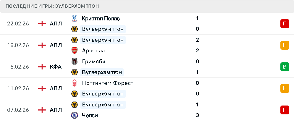 Последние игры Вулверхэмптона