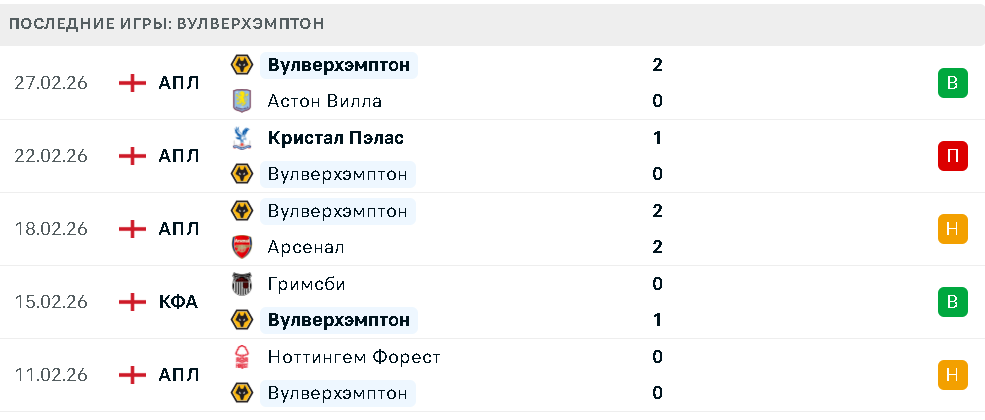 Последние игры Вулверхэмптона