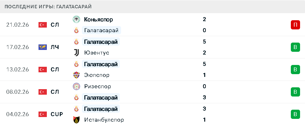 Стамбульцы подходят к матчу в более стабильном состоянии. Поражение от «Коньяспора» в чемпионате Турции стало единственным в пяти последних встречах. В остальных играх «Галатасарай» одержал победы над «Истанбулспором», «Ризеспором», «Эюпспором» и «Ювентусом», демонстрируя высокую результативность.