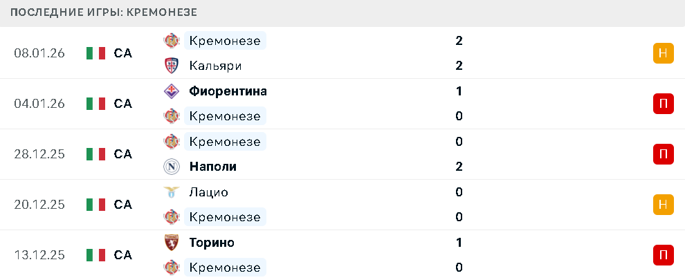 - «Кремонезе» потерпел 6 поражений в 10 последних встречах.