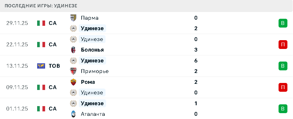 Последние игры «Удинезе»