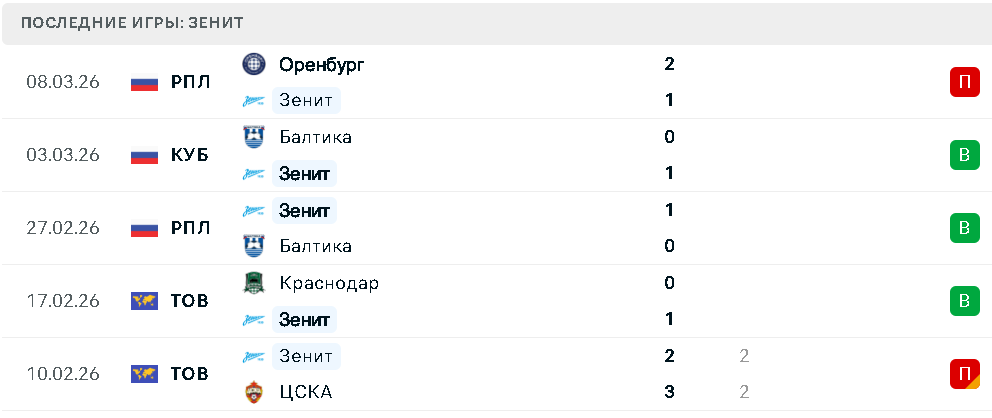 В пяти последних матчах «Зенит» сыграл вничью с ЦСКА, одержал победы над «Краснодаром» и «Балтикой» (дважды), а также потерпел поражение от «Оренбурга».