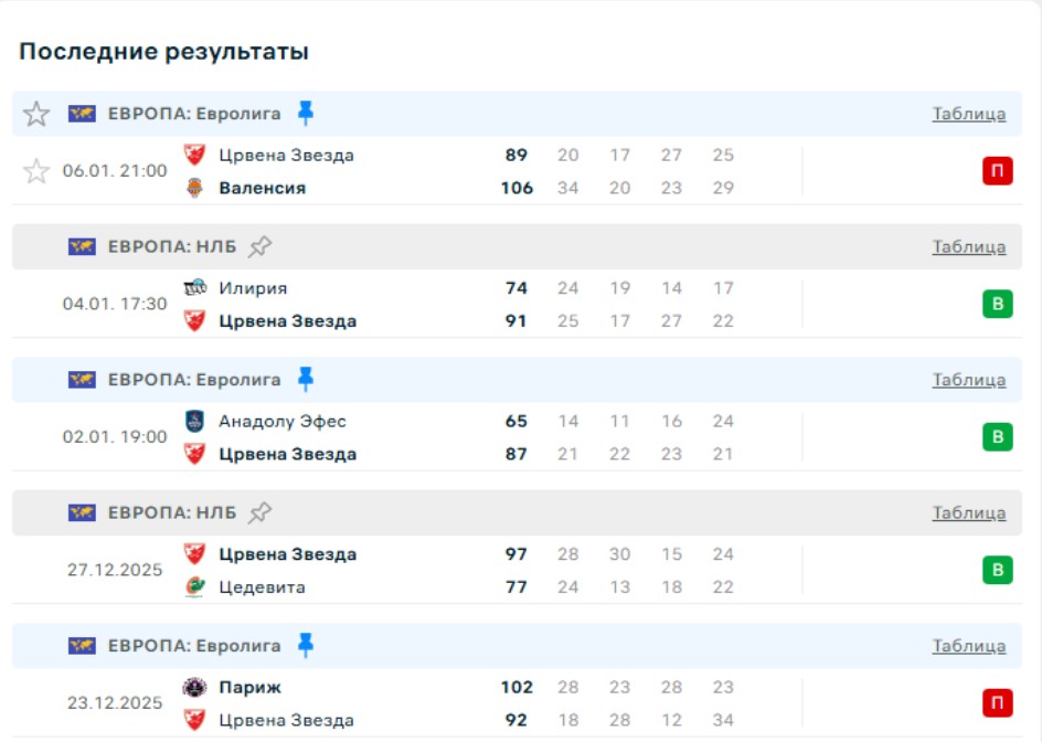 - Црвена Звезда выиграла 5 из 6 предыдущих встреч с учетом выступлений в Адриатической лиге.