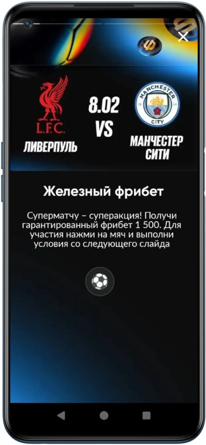 БК BetBoom предлагает железный фрибет к матчу «Ливерпуль» – «Манчестер Сити». Для участия в акции необходимо перейти на страницу предложения, нажать на эмодзи футбольного мяча, внести депозит от 3000 рублей и сделать одиночную ставку от 3000 рублей с коэффициентом от 1,5 на данный матч. После расчета пари вы получите 1500 рублей фрибета.