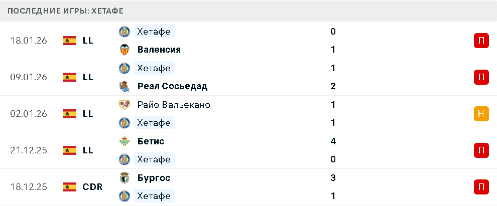 В последних пяти матчах чемпионата «Хетафе» сумел избежать поражения лишь в игре против «Райо Вальекано». В остальных встречах команда уступила «Бургосу», «Бетису», «Реал Сосьедаду» и «Валенсии».