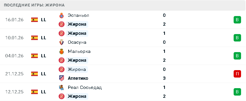 В пяти последних турах Ла Лиги «Жирона» обыграла «Реал Сосьедад», «Мальорку», «Осасуну» и «Эспаньол». Единственное поражение на этом отрезке команда потерпела в матче против мадридского «Атлетико».