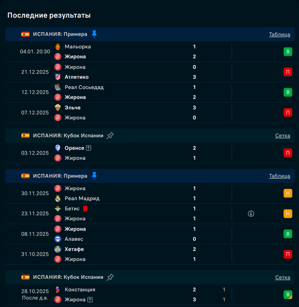 4 января выиграла у «Мальорки» (2:1), до этого проиграла «Атлетико» (0:3), победила «Реал Сосьедад» (2:1), уступила «Эльче» (0:3) и «Оуренсе» (1:2). В 4 из 5 домашних матчей в Ла Лиге «Жирона» не проигрывала, но и не всегда забивала — только 2 победы.
